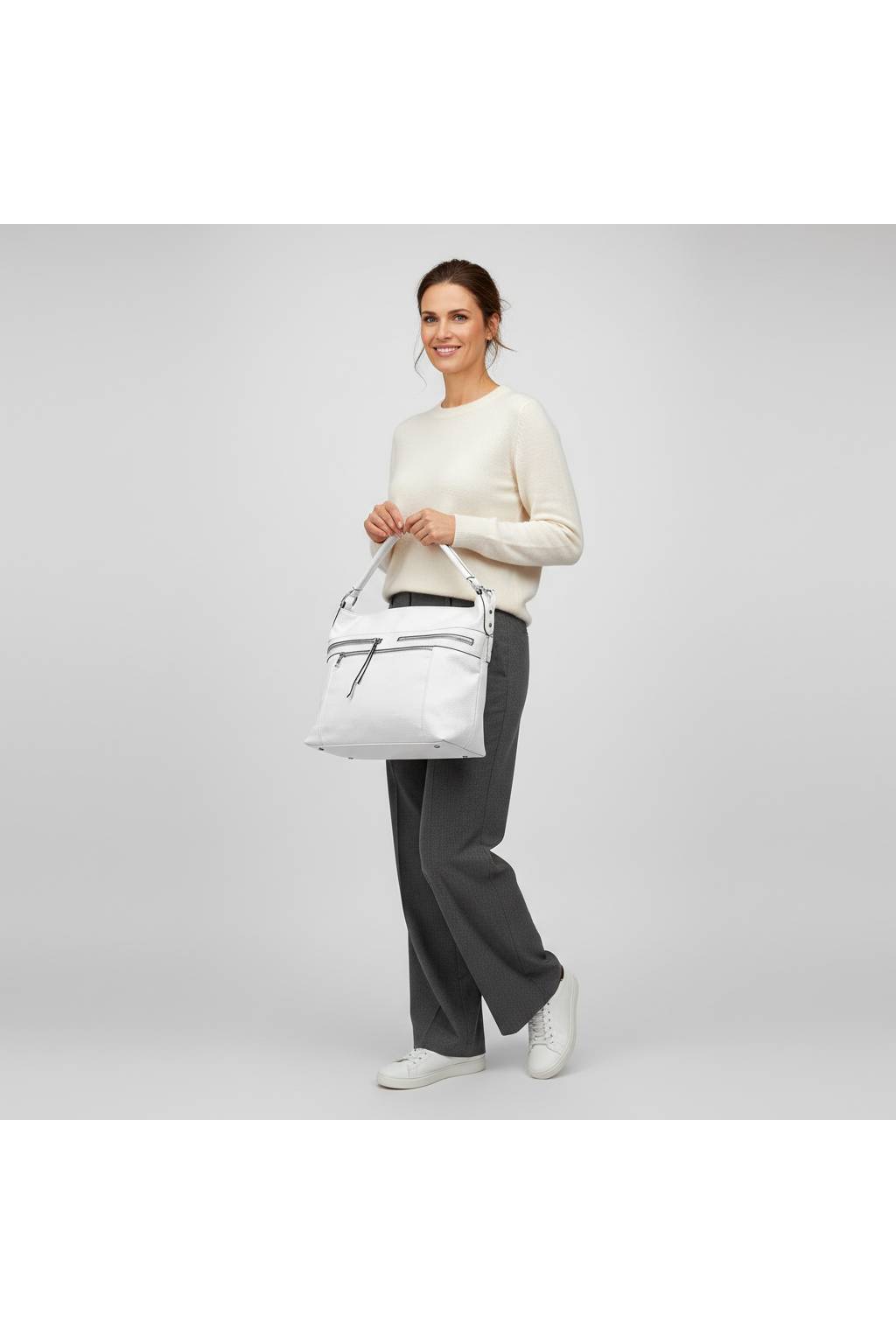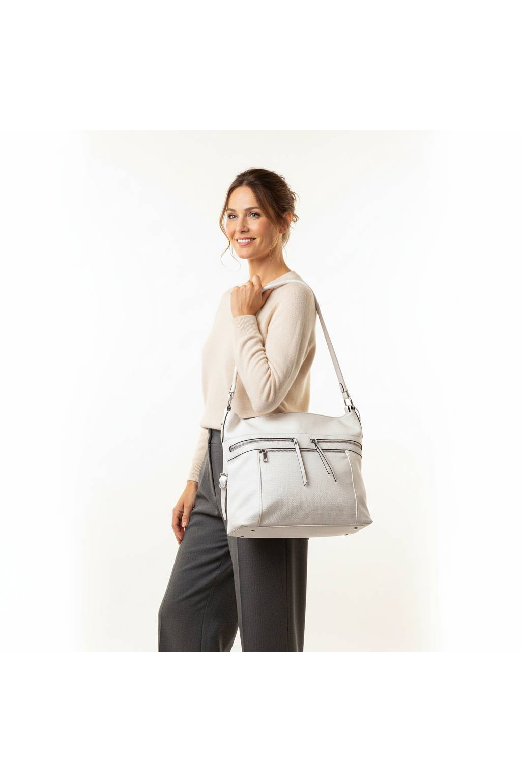 Elegantná a zároveň maximálne praktická dámska kabelka typu hobo, ktorá sa krásne prispôsobí telu a hodí sa na každý deň. Vďaka premyslenému členeniu a viacerým zipsovým vreckám budete mať vo veciach poriadok – mobil, kľúče aj peňaženku vytiahnete za sekundu.