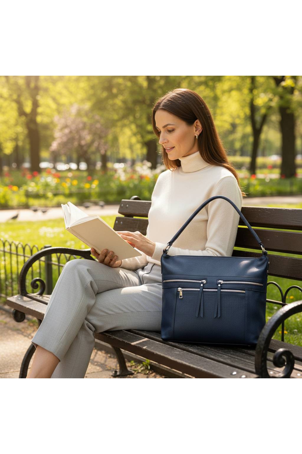 Elegantná a zároveň maximálne praktická dámska kabelka typu hobo, ktorá sa krásne prispôsobí telu a hodí sa na každý deň. Vďaka premyslenému členeniu a viacerým zipsovým vreckám budete mať vo veciach poriadok – mobil, kľúče aj peňaženku vytiahnete za sekundu.