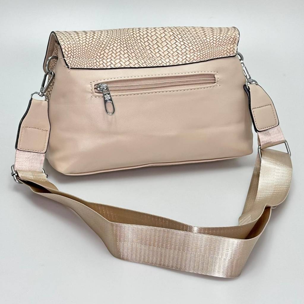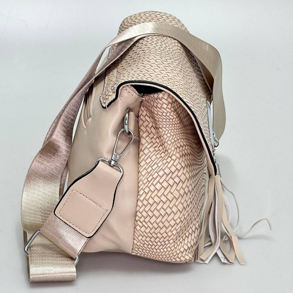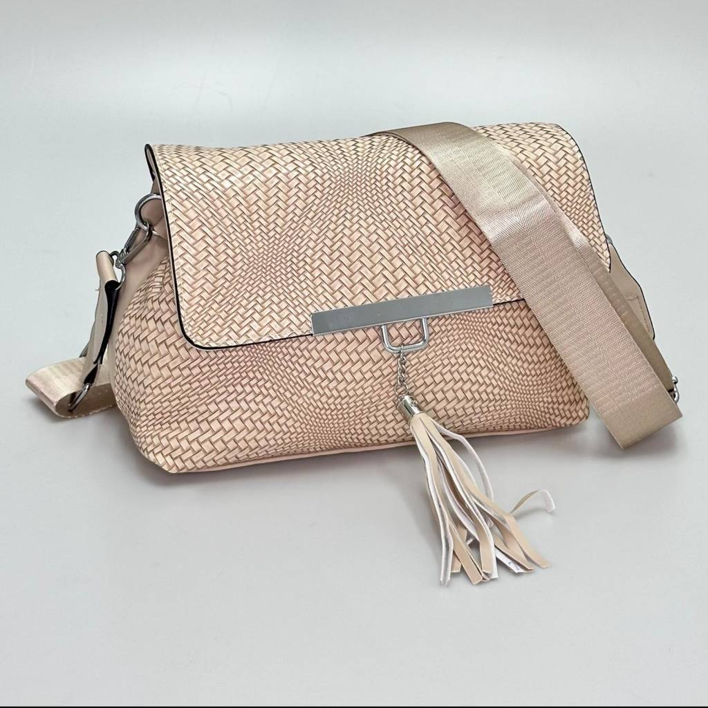 Dámska crossbody kabelka v elegantnom dizajne s prepracovaným pleteným vzorom na prednej strane. Uzatváranie na magnet a zips poskytuje bezpečnosť, vo vnútri sú praktické priehradky na usporiadanie vecí. Kabelka má nastaviteľný popruh pre pohodlné nosenie a ozdobnú strapcovú prívesku, ktorá jej dodáva štýlový vzhľad. Ideálna na každodenné nosenie aj špeciálne príležitosti.