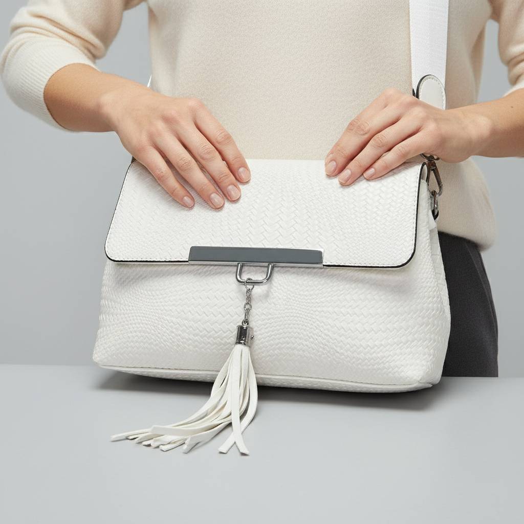 Dámska crossbody kabelka v elegantnom dizajne s prepracovaným pleteným vzorom na prednej strane. Uzatváranie na magnet a zips poskytuje bezpečnosť, vo vnútri sú praktické priehradky na usporiadanie vecí. Kabelka má nastaviteľný popruh pre pohodlné nosenie a ozdobnú strapcovú prívesku, ktorá jej dodáva štýlový vzhľad. Ideálna na každodenné nosenie aj špeciálne príležitosti.