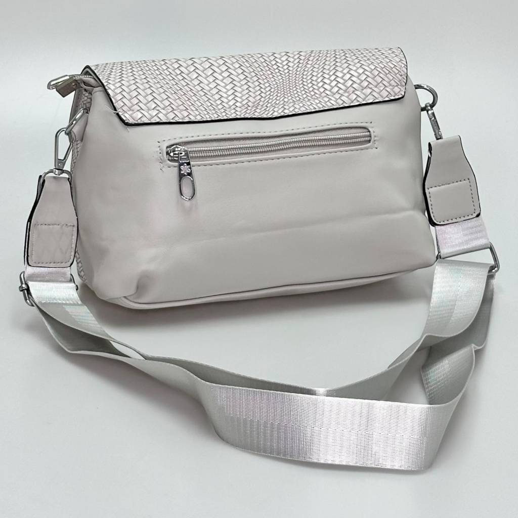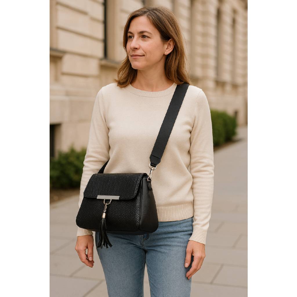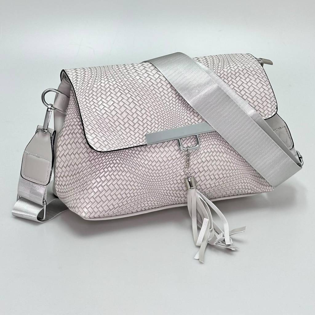 Dámska crossbody kabelka v elegantnom dizajne s prepracovaným pleteným vzorom na prednej strane. Uzatváranie na magnet a zips poskytuje bezpečnosť, vo vnútri sú praktické priehradky na usporiadanie vecí. Kabelka má nastaviteľný popruh pre pohodlné nosenie a ozdobnú strapcovú prívesku, ktorá jej dodáva štýlový vzhľad. Ideálna na každodenné nosenie aj špeciálne príležitosti.