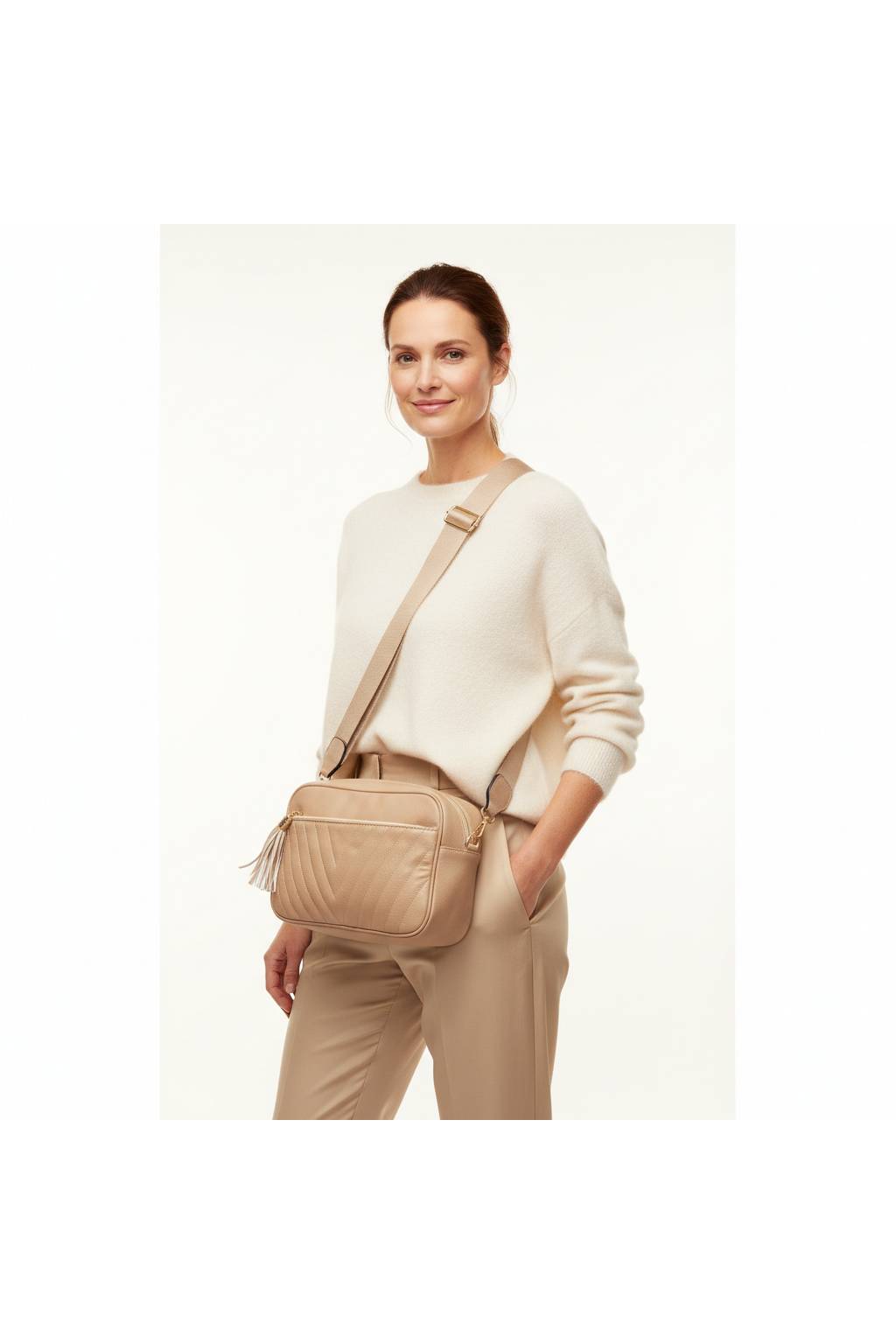 Štýlová mestská crossbody kabelka s decentným prešívaním a ozdobným strapcom. Ideálna na každý deň, do práce, do mesta aj na výlety – kompaktná, ale prekvapivo priestranná.