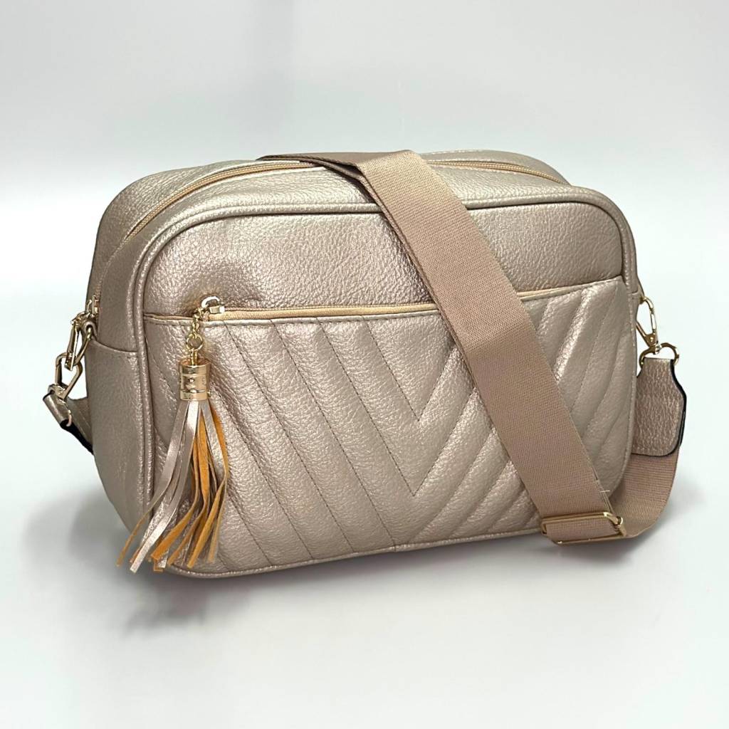 Štýlová mestská crossbody kabelka s decentným prešívaním a ozdobným strapcom. Ideálna na každý deň, do práce, do mesta aj na výlety – kompaktná, ale prekvapivo priestranná.