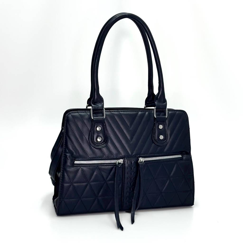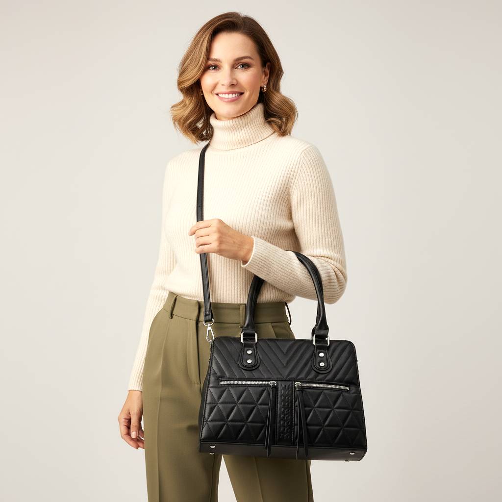 Elegantná kabelka v modernom prešívanom „chevron & diamond“ štýle, ktorú môžete nosiť v ruke, na ramene aj crossbody. Praktické vonkajšie vrecká na zips, ľahká starostlivosť a ideálna veľkosť na každý deň do mesta, práce aj na nákupy.