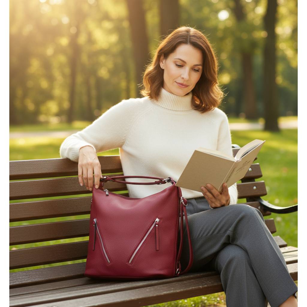Kabelka má nadčasový hobo strih so širokým dnom, vďaka ktorému stojí stabilne a zostáva prehľadná. Hlavný vstup na zips chráni obsah, vo vnútri nájdete priehradky na telefón, okuliare či karty a stredovú zipovú kapsu na cennejšie veci. Na prednej strane sú dve vertikálne zipsové kapsy a vzadu samostatné vrecko – ideálne na kľúče alebo cestovné doklady. Materiál príjemne mäkký na dotyk, ľahko sa čistí navlhčenou handričkou.