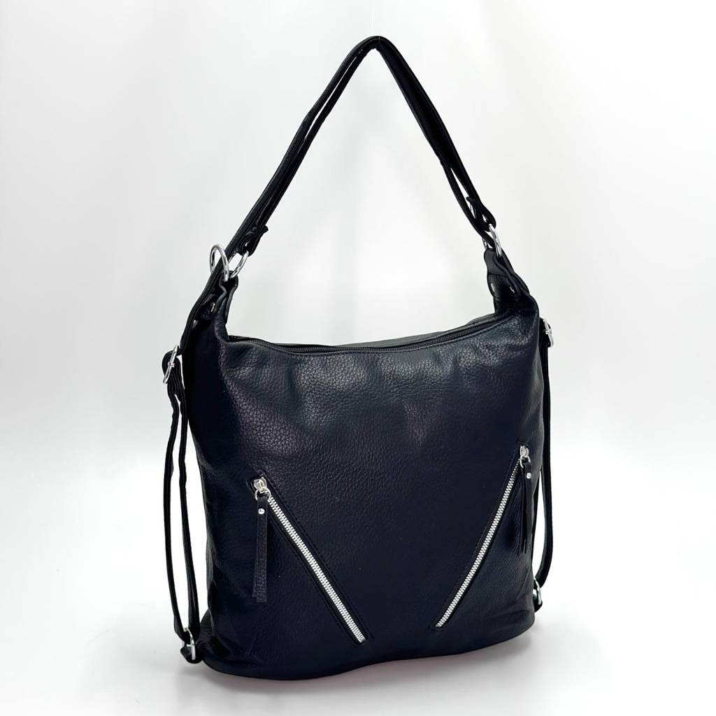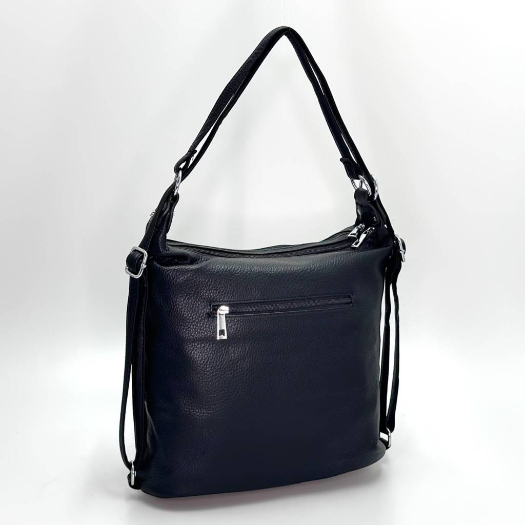 Kabelka má nadčasový hobo strih so širokým dnom, vďaka ktorému stojí stabilne a zostáva prehľadná. Hlavný vstup na zips chráni obsah, vo vnútri nájdete priehradky na telefón, okuliare či karty a stredovú zipovú kapsu na cennejšie veci. Na prednej strane sú dve vertikálne zipsové kapsy a vzadu samostatné vrecko – ideálne na kľúče alebo cestovné doklady. Materiál príjemne mäkký na dotyk, ľahko sa čistí navlhčenou handričkou.