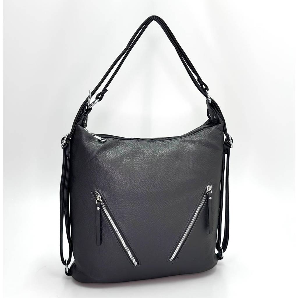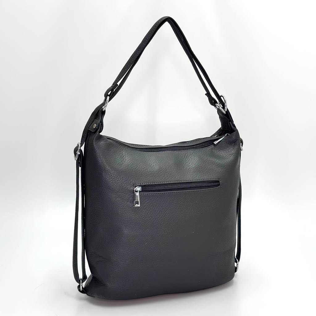 Kabelka má nadčasový hobo strih so širokým dnom, vďaka ktorému stojí stabilne a zostáva prehľadná. Hlavný vstup na zips chráni obsah, vo vnútri nájdete priehradky na telefón, okuliare či karty a stredovú zipovú kapsu na cennejšie veci. Na prednej strane sú dve vertikálne zipsové kapsy a vzadu samostatné vrecko – ideálne na kľúče alebo cestovné doklady. Materiál príjemne mäkký na dotyk, ľahko sa čistí navlhčenou handričkou.