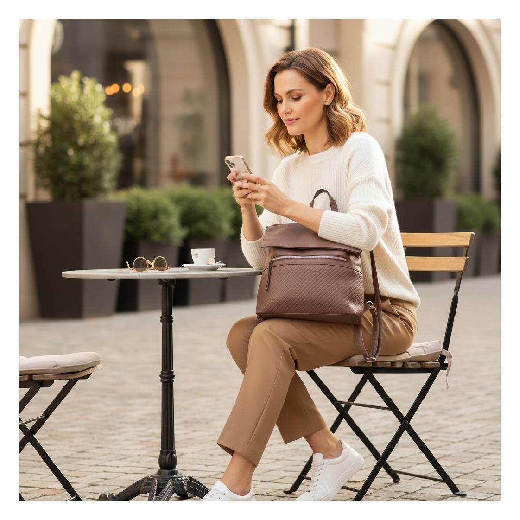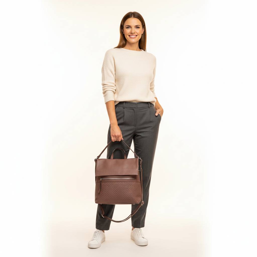 Univerzálny dámsky ruksak 2v1 s horným uchom a preklopnou chlopňou. Vďaka nastaviteľným popruhom ho pohodlne nosíte na chrbte aj cez rameno ako kabelku. Mäkká, na dotyk príjemná eko koža, podšívka, kvalitné kovanie. Zmestí A4, fľašu na vodu, peňaženku aj denné potreby. Dostupný vo viacerých farebných variantoch, aby ladil k vášmu šatníku.