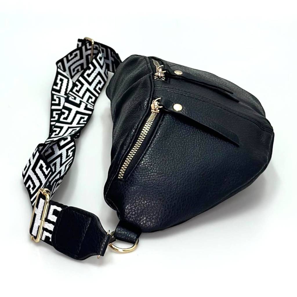 Kabelka disponuje dvoma prednými vreckami na zips, ktoré zaisťujú pohodlný prístup k drobnostiam, ako sú kľúče, telefón či kozmetika. Hlavný priestor je priestranný a bezpečne uzatvárateľný zipsom. Veľkou prednosťou je široký nastaviteľný popruh s čierno-bielym geometrickým vzorom, ktorý kabelke dodáva trendy vzhľad a zároveň zaručuje komfort pri nosení.