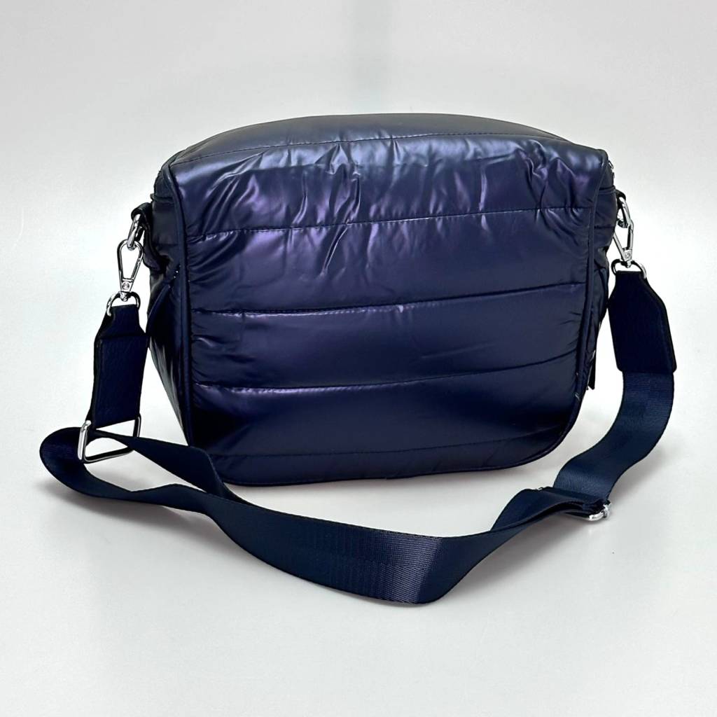 Trendy „puffer“ kabelka, ktorú ponosíte cez rameno aj crossbody. Tmavomodrý lesk, prešívaný dizajn, ľahučká konštrukcia a praktické zipsové priečinky – ideálna do mesta, do práce aj na víkend.