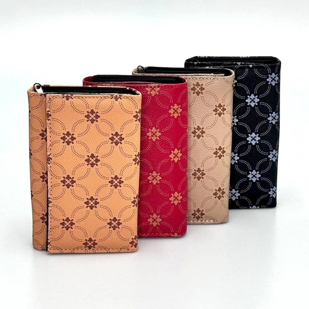 Štýlová dámska peňaženka s elegantným kvetinovým vzorom, ktorá spája praktickosť a moderný dizajn. Dostupná je v štyroch atraktívnych farebných prevedeniach – béžová, červená, telová a čierna.