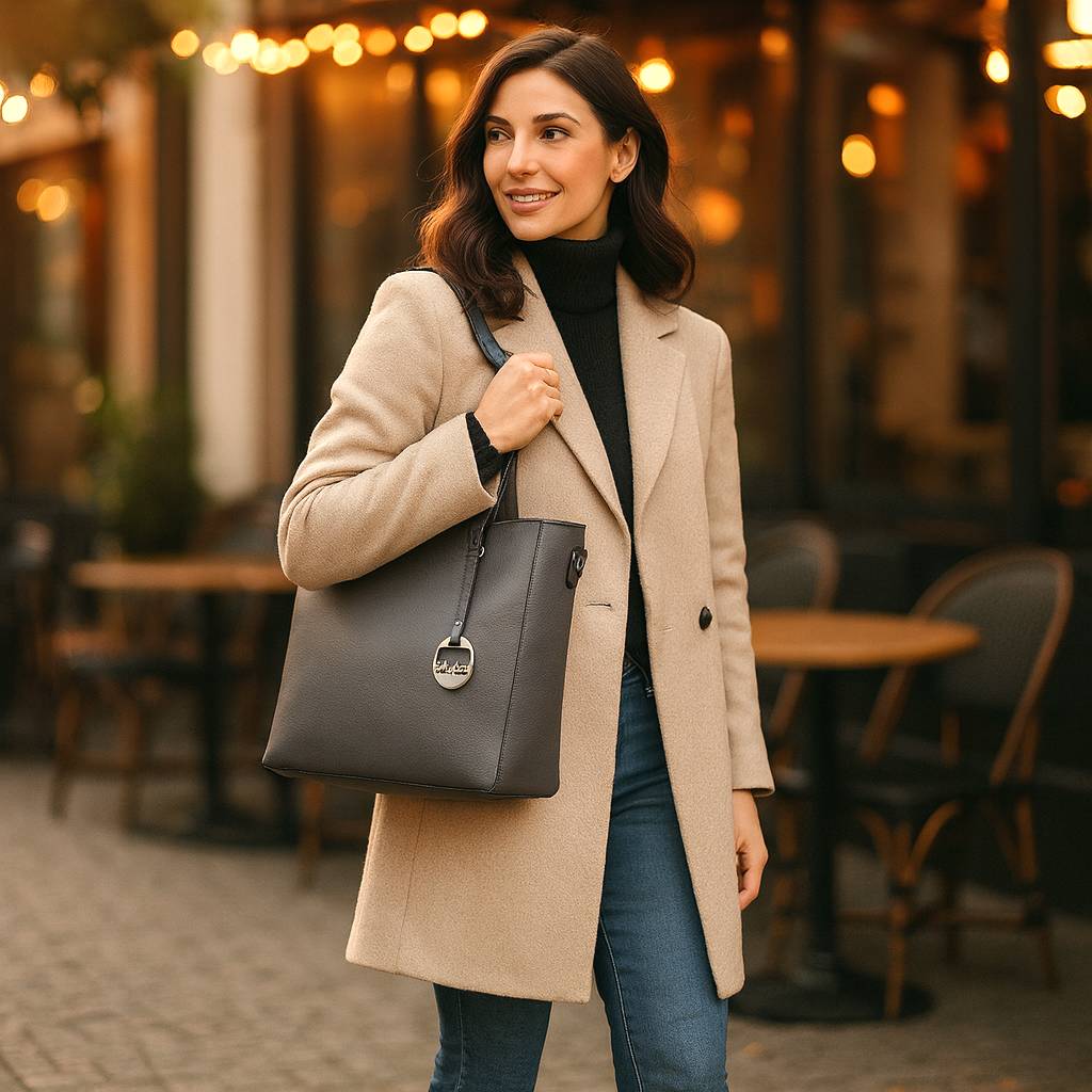 Elegantná, priestranná a spoľahlivá. Táto čierna dámska kabelka v nadčasovom „shopper“ štýle je ideálna na každý deň – do práce, do mesta aj na cestovanie. Vďaka dlhým uchám ju pohodlne dáte na rameno a keď potrebujete voľné ruky, jednoducho pripnete nastaviteľný popruh a nosíte ju crossbody. Jemne štruktúrovaný povrch a kovové detaily dodávajú kabelke luxusný vzhľad, ktorý sa hodí ku všetkým outfitom.