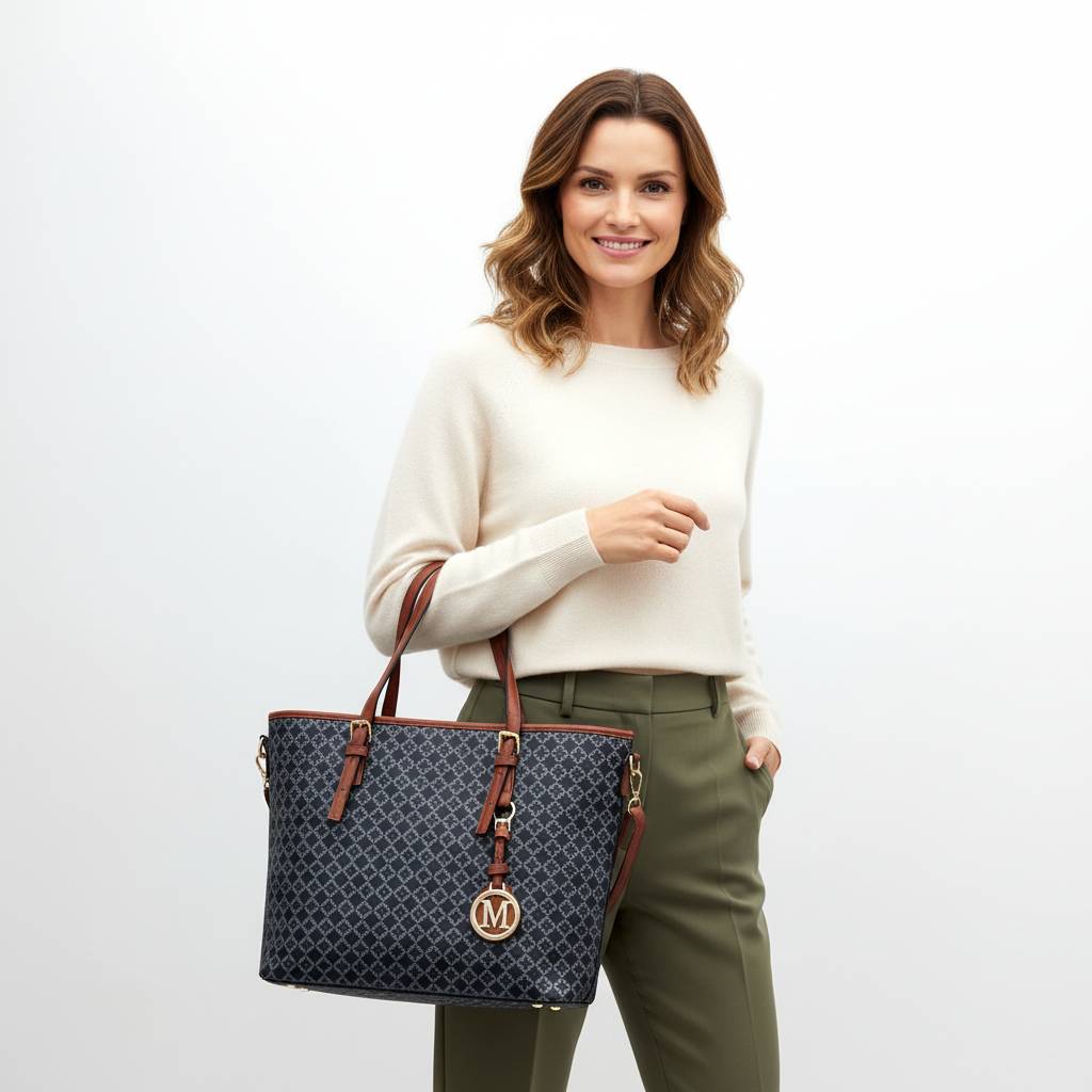 Elegantná shopper kabelka s jemným all-over vzorom a kontrastnými remienkami je stvorená na každý deň – do práce, na nákupy aj do mesta. Vďaka premyslenému vnútornému usporiadaniu udrží poriadok, pôsobí upravene a zároveň je príjemne ľahká.