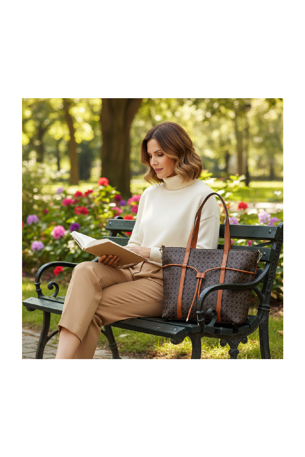 Elegantná shopper / tote kabelka s decentným monogramovým vzorom a kontrastnými uchami. Vďaka premyslenému vnútornému členeniu a odnímateľnému crossbody popruhu je ideálna na každý deň, do práce, na nákupy aj cestovanie. Dostupná vo viacerých farebných variantoch, aby ste si ľahko doladili svoj štýl.