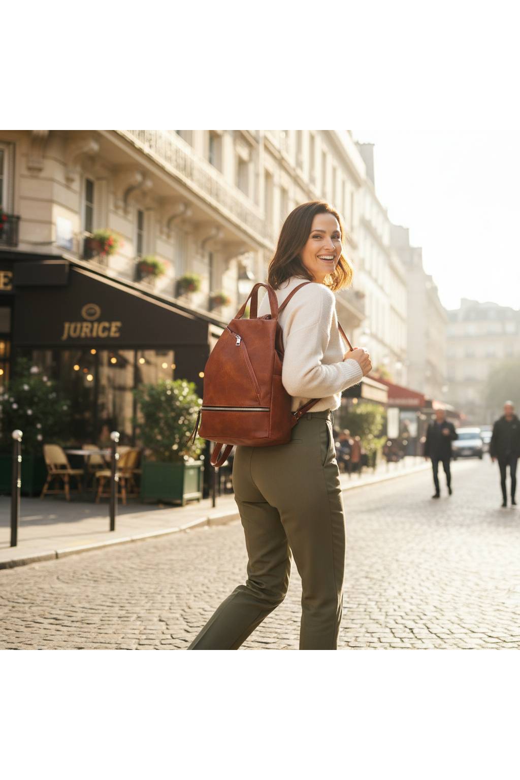 Štýlový ľahký batoh do mesta, ktorý vďaka premysleným popruhom ľahko premeníte aj na kabelku cez plece. Minimalistický dizajn s výrazným šikmým zipsom a spodným vreckom sadne k džínsom aj šatám.