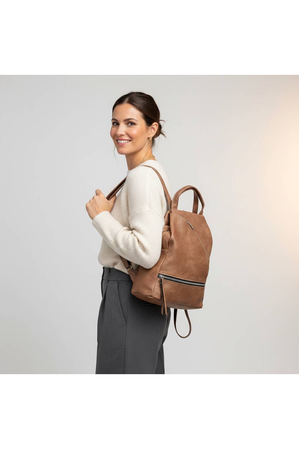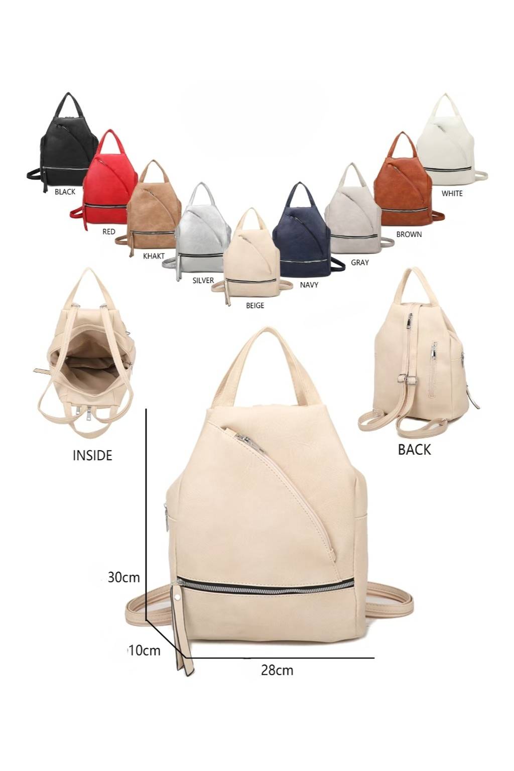 Štýlový ľahký batoh do mesta, ktorý vďaka premysleným popruhom ľahko premeníte aj na kabelku cez plece. Minimalistický dizajn s výrazným šikmým zipsom a spodným vreckom sadne k džínsom aj šatám.
