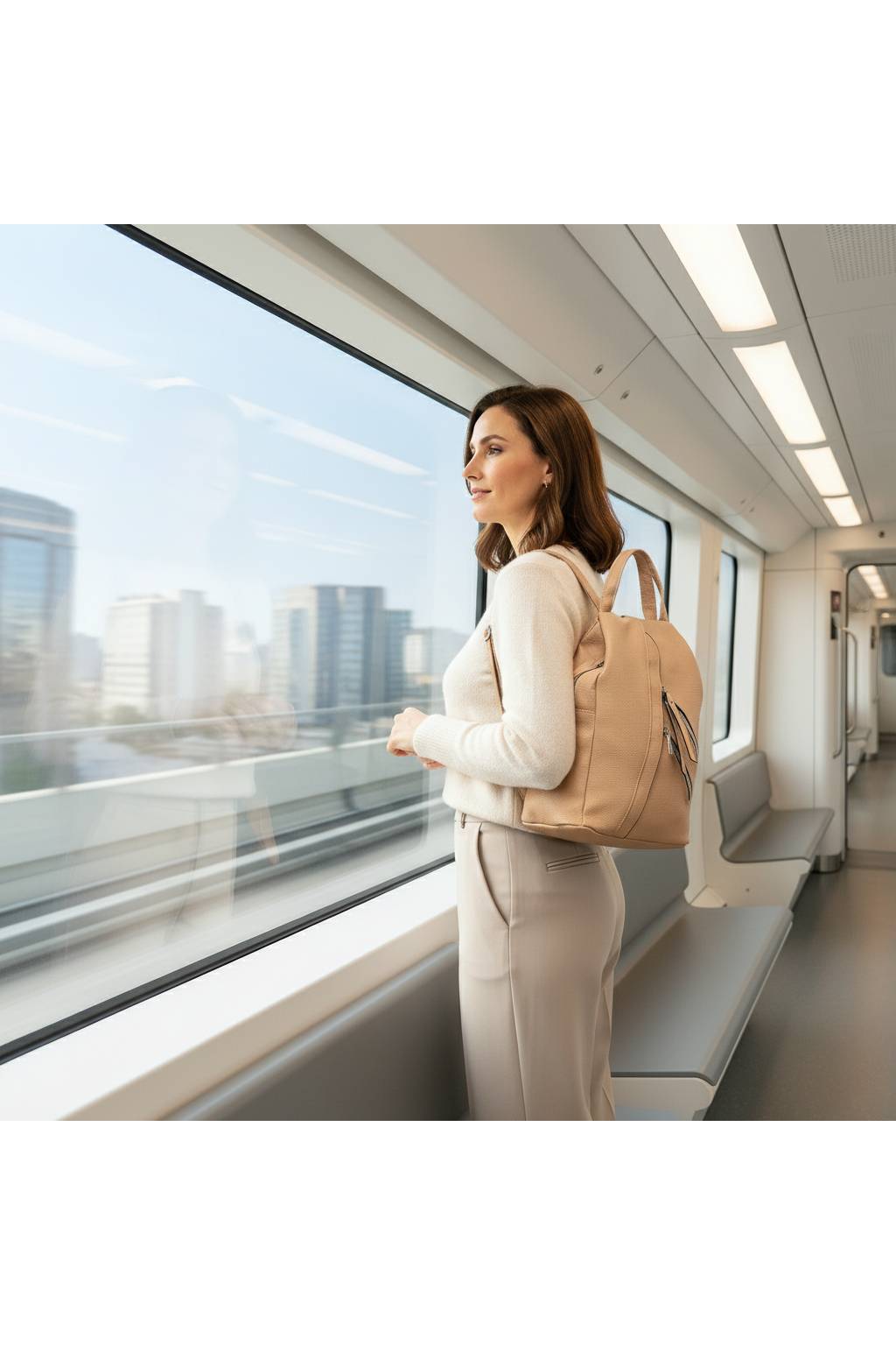 Elegantný look – čisté línie, moderný strih a nadčasová béžová farba.