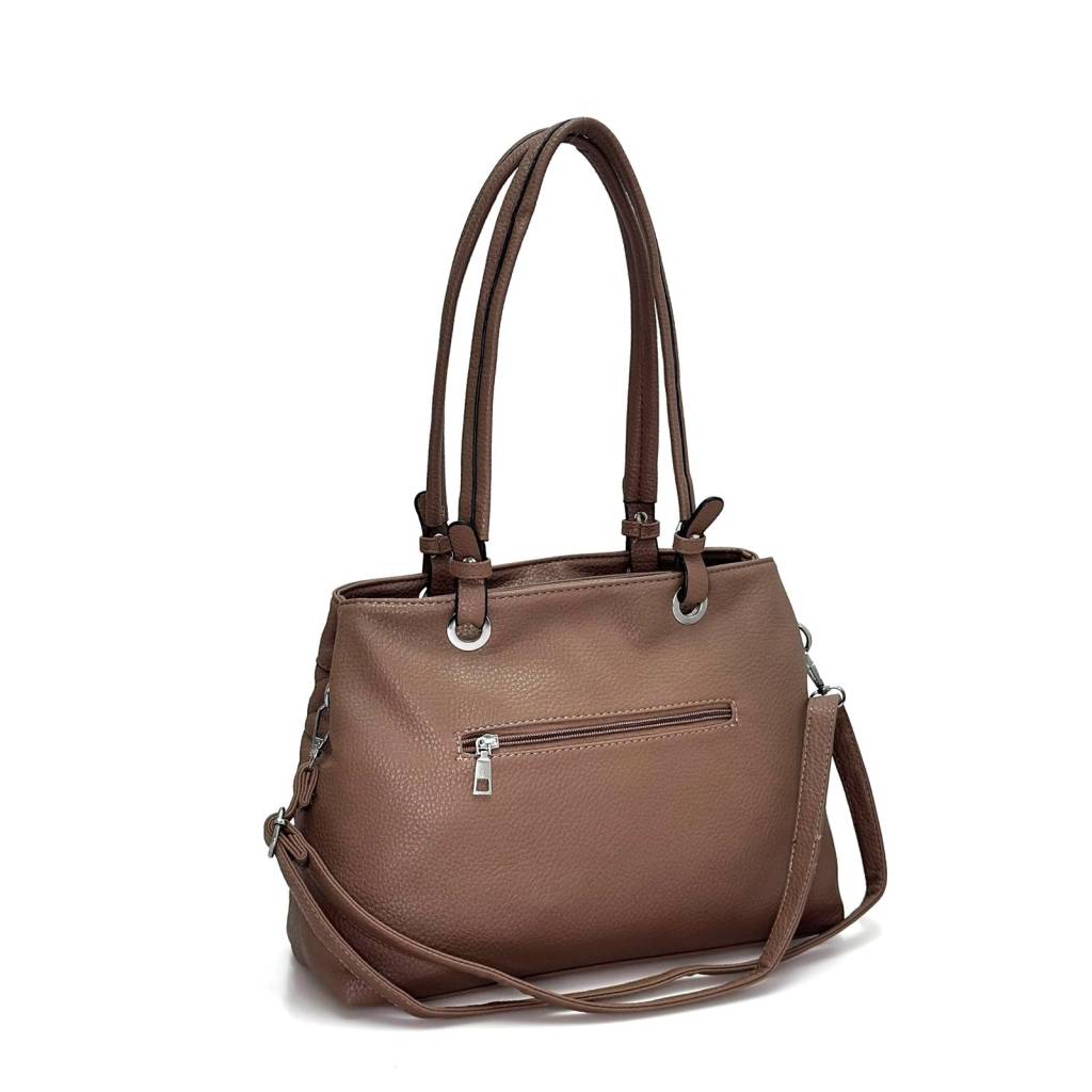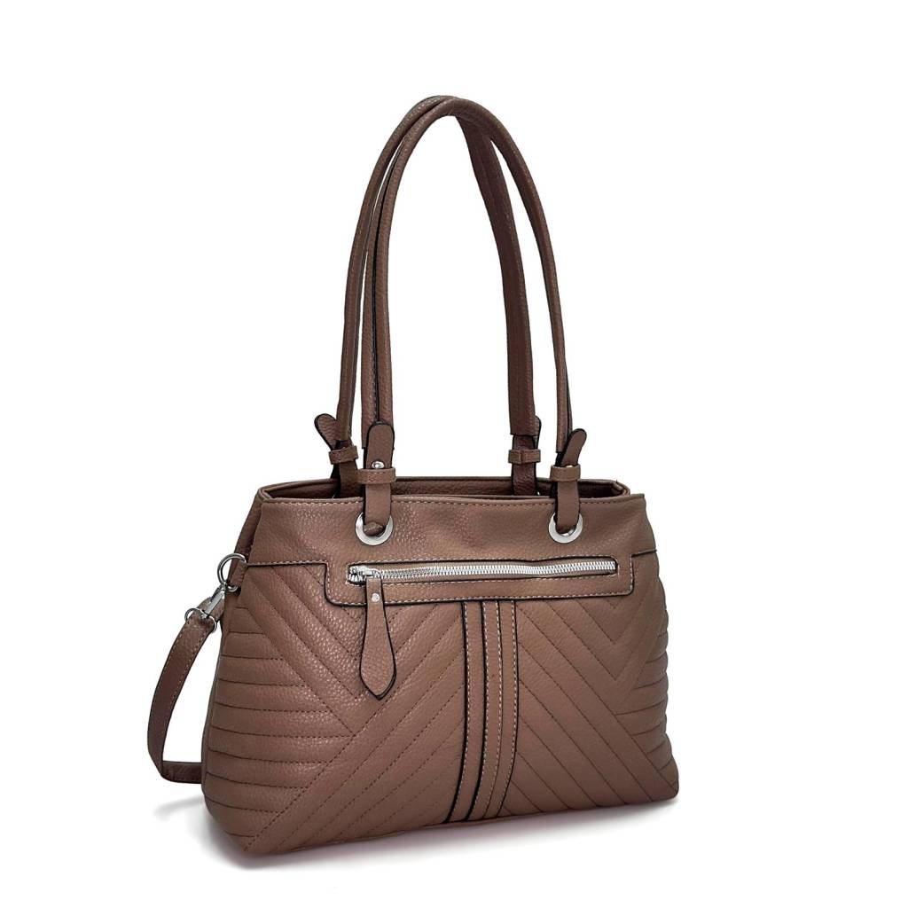 Elegantná dámska kabelka v univerzálnej farbe spája moderný vzhľad a praktickú organizáciu. Predný diel zdobí prešívaný chevron vzor a decentné kovanie v striebornej farbe. Vďaka dlhým dvojitým rúčkam ju pohodlne zavesíte na rameno; súčasťou je aj odnímateľný, nastaviteľný popruh na nosenie „crossbody“.