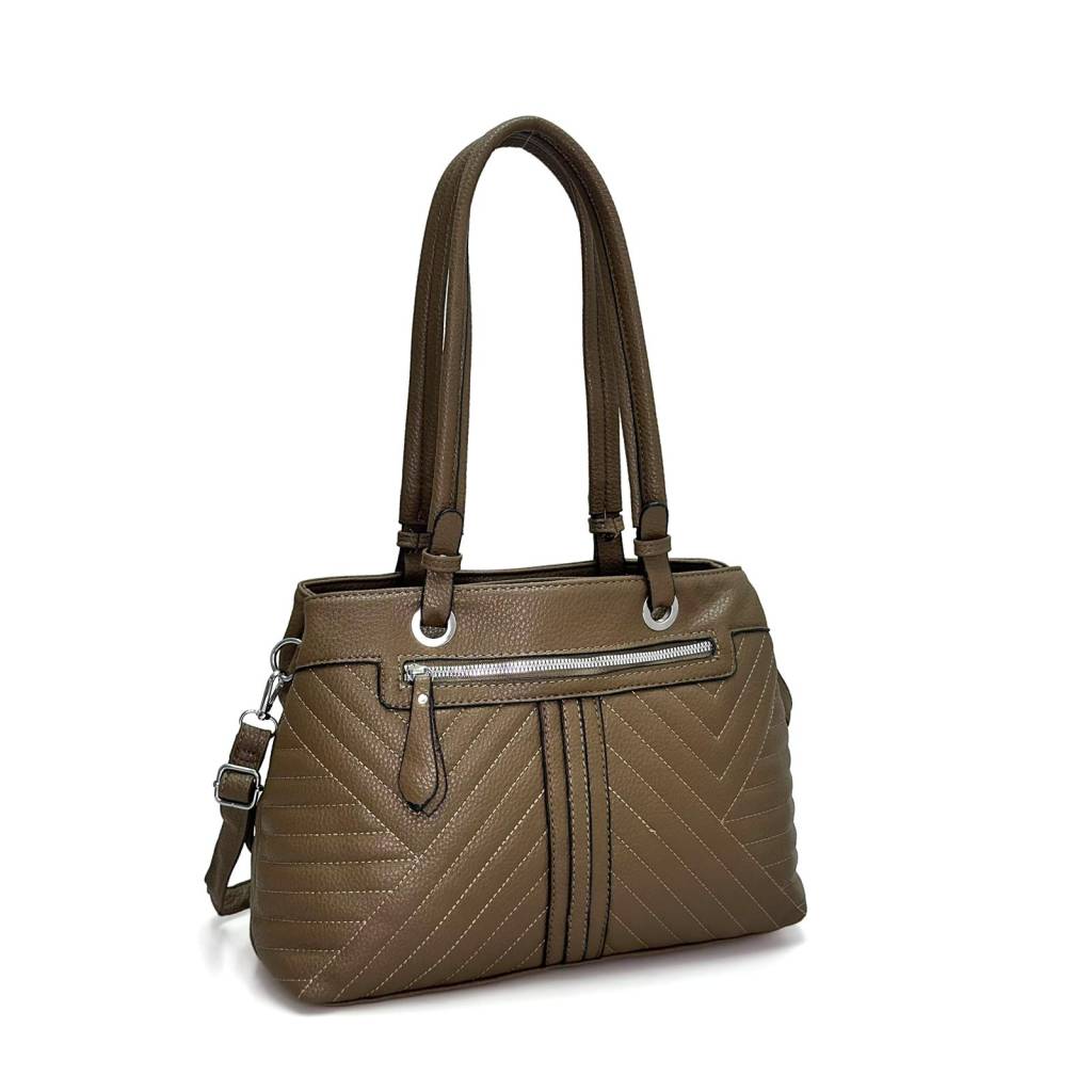 Elegantná dámska kabelka v univerzálnej farbe spája moderný vzhľad a praktickú organizáciu. Predný diel zdobí prešívaný chevron vzor a decentné kovanie v striebornej farbe. Vďaka dlhým dvojitým rúčkam ju pohodlne zavesíte na rameno; súčasťou je aj odnímateľný, nastaviteľný popruh na nosenie „crossbody“.