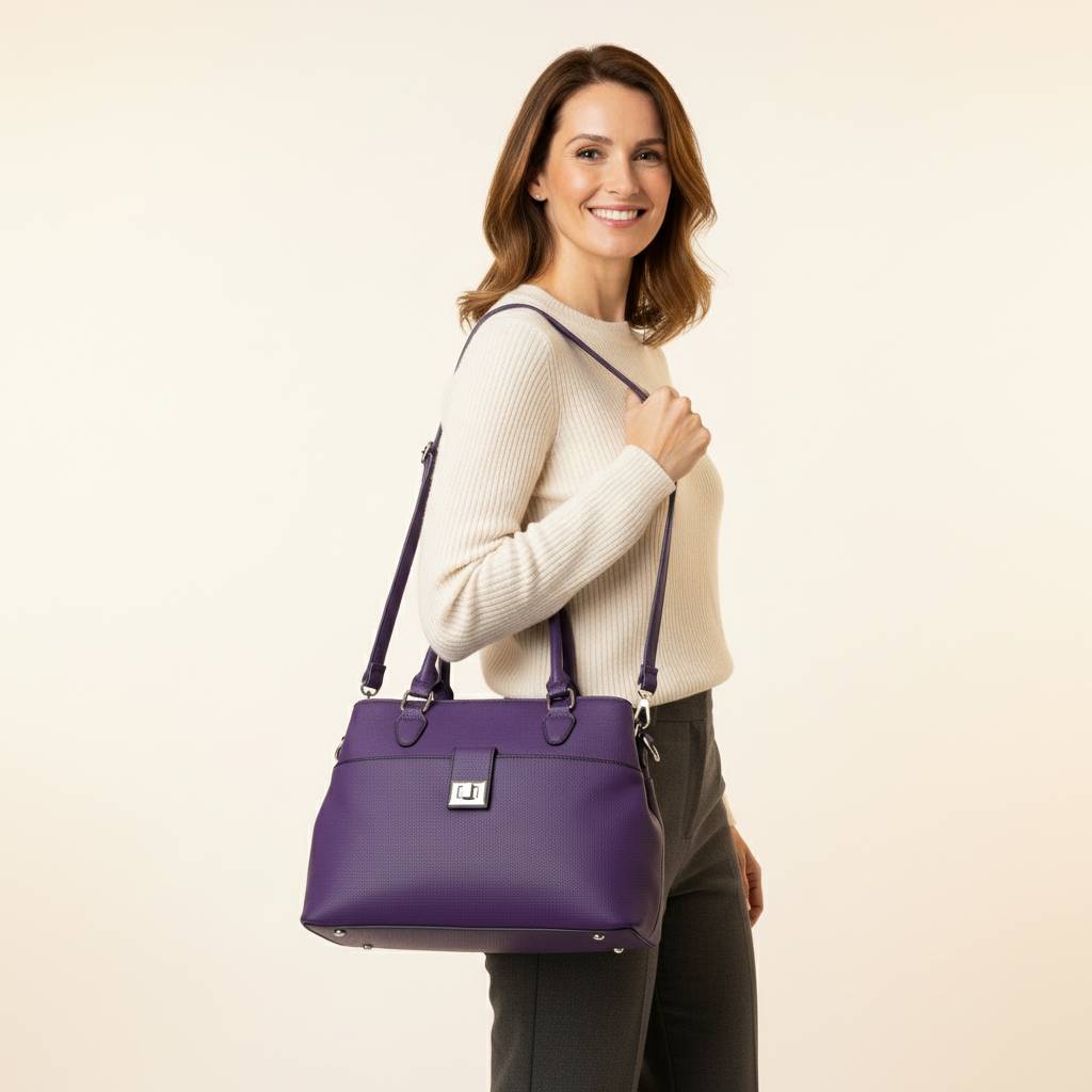Elegantná každodenná kabelka v univerzálnej farbe, ktorá kombinuje čistý dizajn, praktické členenie a pohodlné nosenie v ruke aj na ramene. Nadčasový tvar, jemná štruktúra materiálu a kovové detaily z nej robia univerzálny kúsok do práce, mesta aj na voľný čas.
