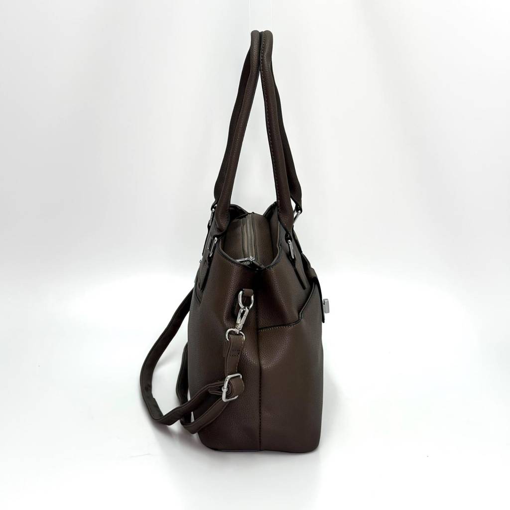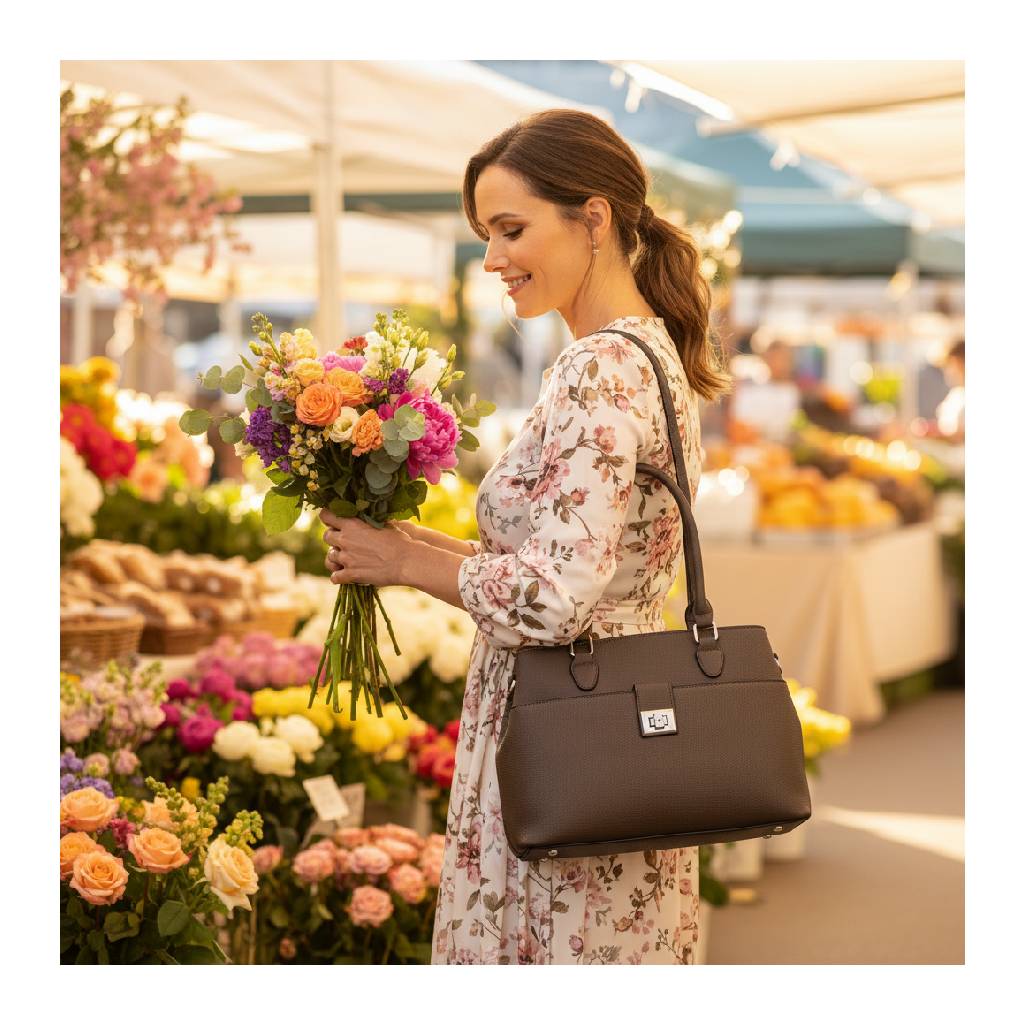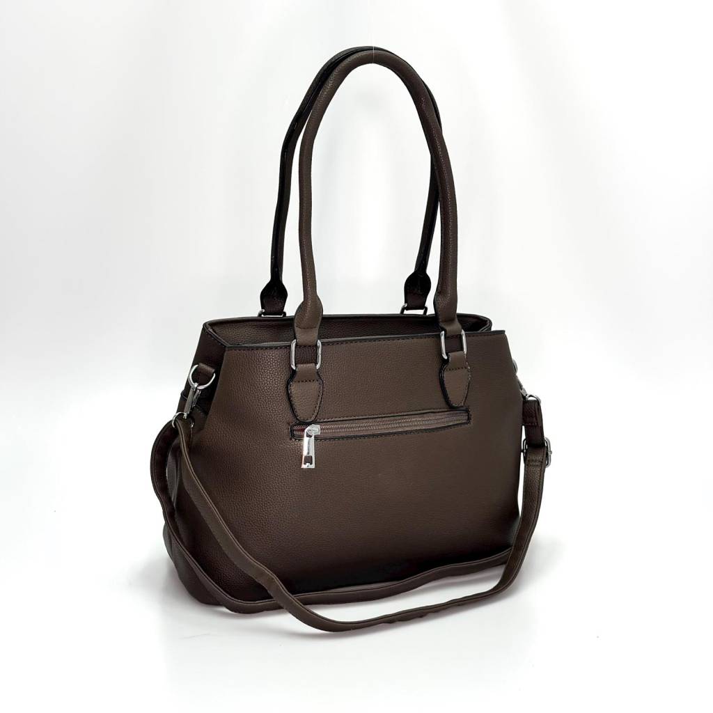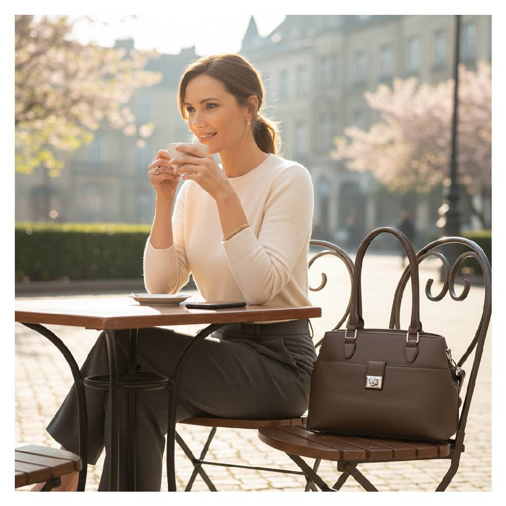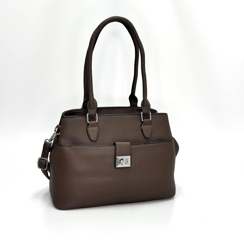 Elegantná každodenná kabelka v univerzálnej farbe, ktorá kombinuje čistý dizajn, praktické členenie a pohodlné nosenie v ruke aj na ramene. Nadčasový tvar, jemná štruktúra materiálu a kovové detaily z nej robia univerzálny kúsok do práce, mesta aj na voľný čas.