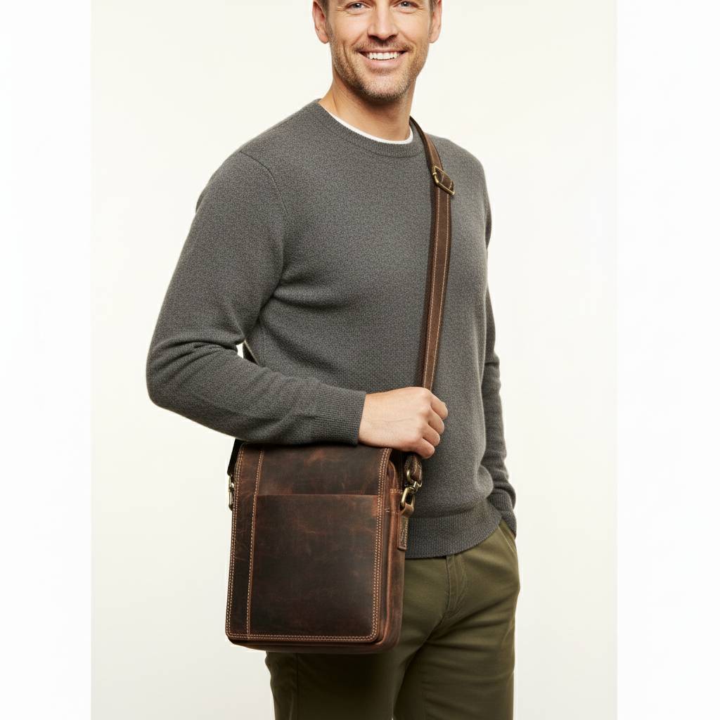 Štýlová pánska crossbody taška v retro „crazy horse“ vzhľade je ideálny spoločník do práce, mesta aj na cestovanie. Kompaktne usporiadané priehradky udržia mobil, peňaženku, kľúče, doklady aj menší notebook/tablet do ~10" v maximálnom poriadku. Hrubší nastaviteľný popruh s koženým pásikom sa nosí pohodlne celý deň.