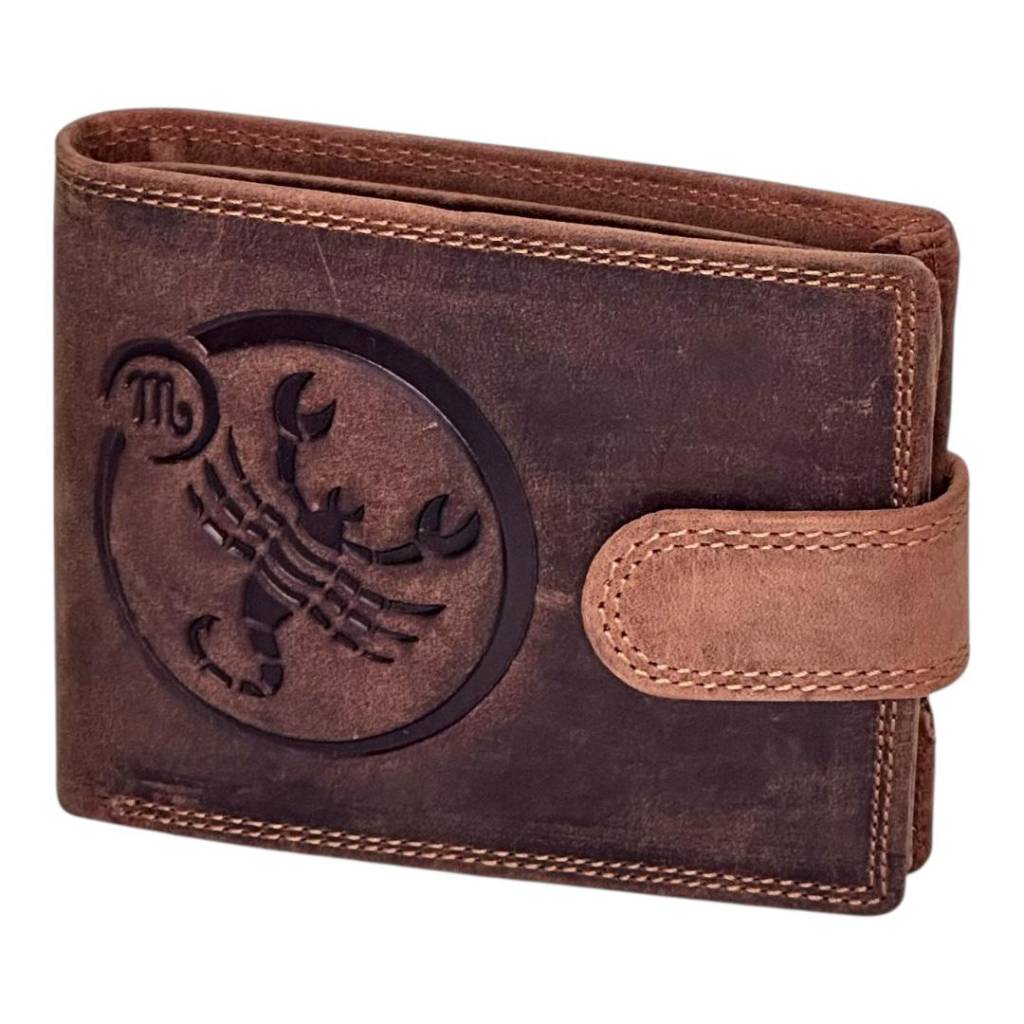 Elegantná pánska peňaženka s hlbokou ražbou znamenia Škorpión. Šitá z poctivej hovädzej kože typu Crazy Horse v matne hnedom „vintage“ prevedení. Premyslené členenie, bezpečné zapínanie na remienok s cvočkom a robustné švy – istota na každý deň aj ako originálny darček pre Škorpióna.