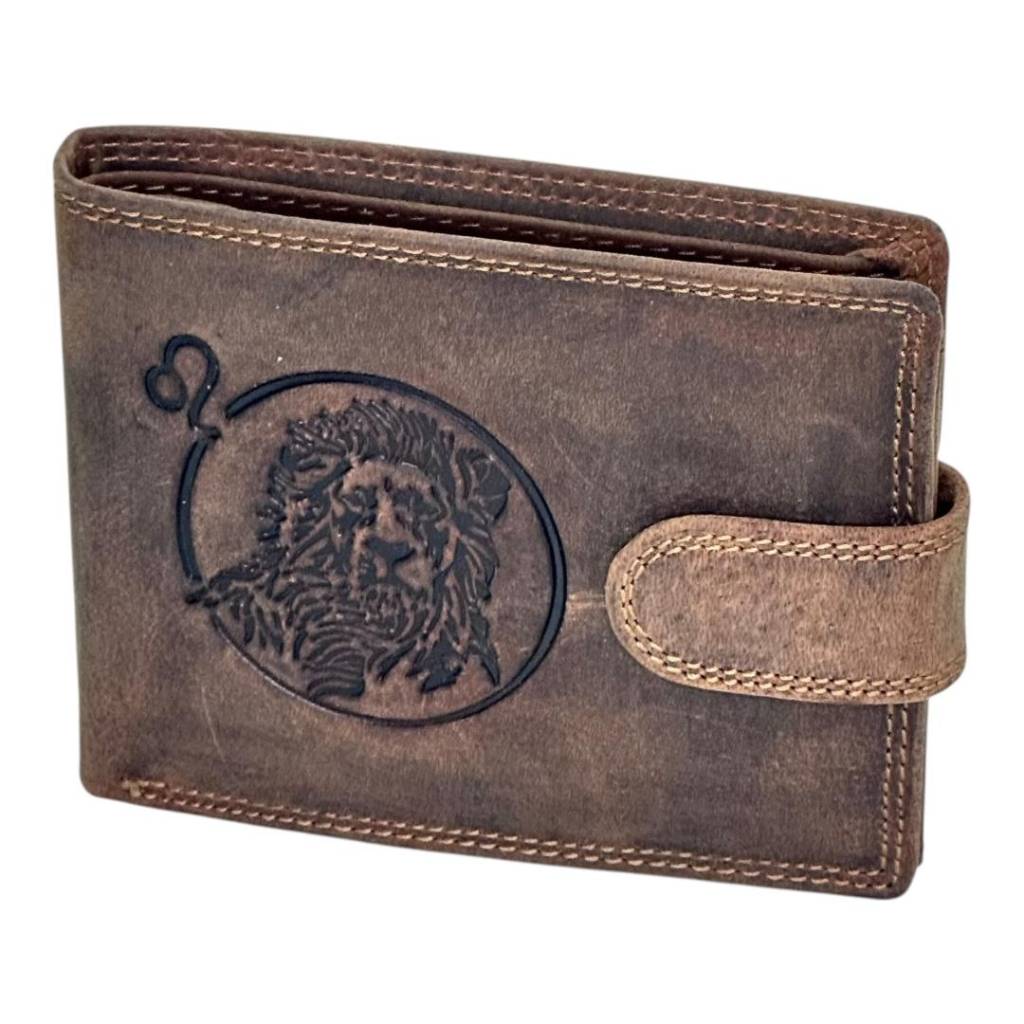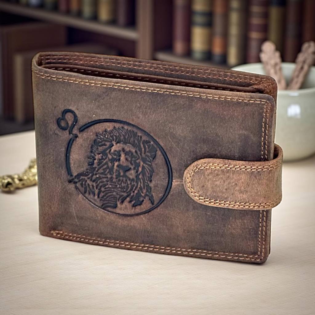 Štýlová pánska peňaženka z odolnej pravej hovädzej kože v úprave Crazy Horse spája robustnosť, praktické vnútro a charakteristický reliéf znamenia zverokruhu – Lev. Patinovaná hnedá koža časom krásne zreje, drobné škrabance sa dajú ľahko rozleštiť a peňaženka získava unikátny vzhľad.